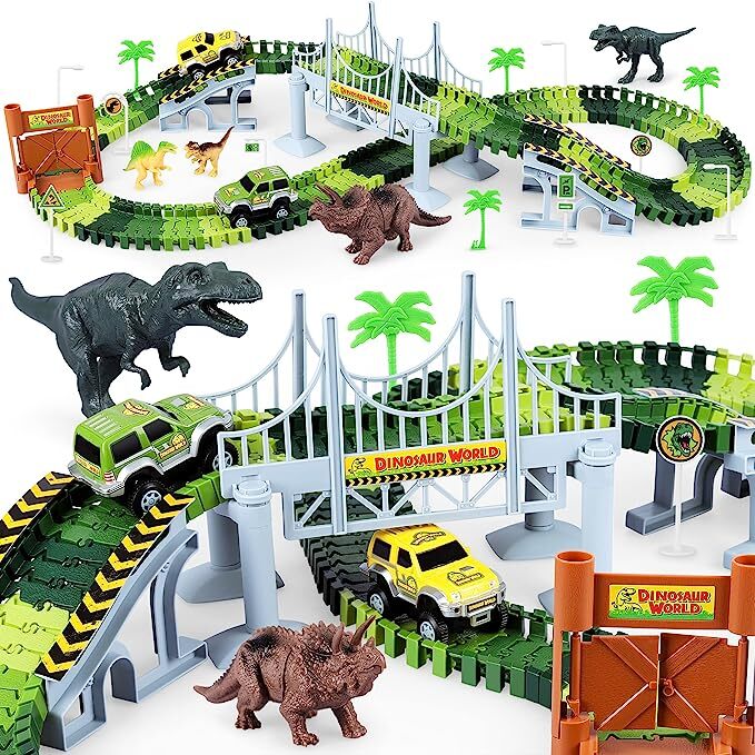 Great Developmental Toy: This dinosaur race track set includes track pieces x 144, Race Car Toys x 2, dinosaurs x 4, sign x 8, door x 1, bridge x 1, slopes x 2, tree x 4, tires x 4,other accessories x 17. Perfect for developing children’s fine motor skills, hand-eye coordination, and attention span.